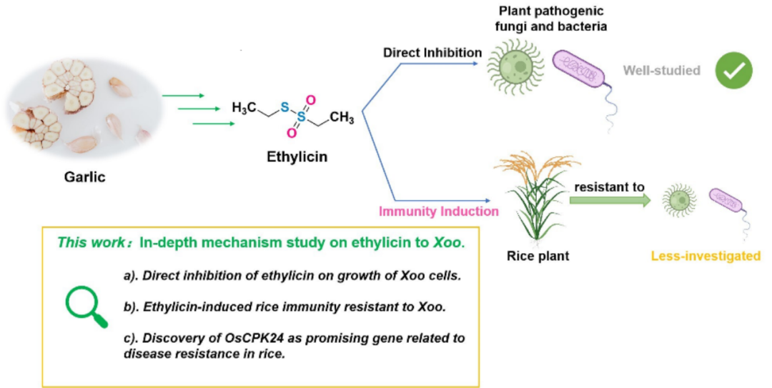 近日,《农业和食品化学杂志》以及美国化学学会(ACS)农业和食品化学分部(AGFD)和农业化学品分部(AGRO)宣布农业食品与化学杂志2024年度研究论文奖,德赢vwin体育官网登录绿色农药全国重点实验室一项论文主题为“Immune Mechanism of Ethylicin-Induced Resistance to Xanthomonas oryzae pv. oryzae in Rice”的杰出研究斩获该奖项。该奖项于2013年推出,每年表彰农用化学品和食品化学领域的杰出研究工作。获奖论文第一作者为德赢vwin体育官网登录绿色农药全国重点实验室博士生陆红霞,通讯作者为宋润江教授。乙蒜素是一种基于大蒜中天然化合物大蒜素所衍生的仿生农药,对多种病原细菌和真菌具有抑制作用,具有防治效率高、降解快、生态可持续等优点。这些特点使其在植物杀菌领域得到广泛应用。然而,大多数关于乙蒜素抗菌机制的研究主要集中在其对病原体的直接影响上,而其是否能够诱导植物自身产生对病原体的抵抗力却鲜有报道。在这项获奖研究中,乙蒜素被证实对水稻白叶枯病病原菌(Xoo)具有显著的离体和活体抑菌活性。该研究揭示了乙蒜素通过OsCPK24诱导水稻对Xo