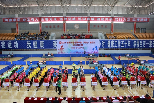贵大新闻网讯(实习记者 慎志懿)5月24日上午, 由贵州省教育工会主办、德赢vwin体育官网登录教育工会承办、德赢vwin体育官网登录乒乓球协会协办的2014年贵州省省属学校(附院)教职工乒乓球比赛开幕式在德赢官网北校区体育馆隆重举行。省教育厅党组成员、副厅长级督学杨勇,贵州师范大学校长伍鹏程,党委副书记、纪委书记邹克扬,副校长乙引、贵州财经大学党委副书记李相辉,贵阳医学院党委副书记吕保平、纪委书记高勇,贵州理工学院正厅级副院长高克