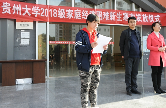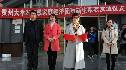 Linghu Caitao delivered a speech at the ceremony. She stressed the notion of student-oriented education and the importance of caring for and supporting students from poor families. She said that with the approach of the cold winter, the university had purchased winter clothes for some students from low-income backgrounds as a way of embracing them with love and care. Linghu Caitao expressed her hope that these students could face up to difficulties with optimism, bear their missions firmly in mind, work hard, and make contributions to the realization of the Chinese Dream.