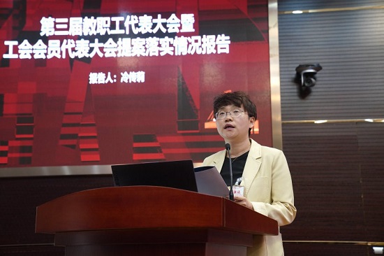 Leng Chuanli, director of the Democratic Proposal Management Committee for the third meeting of college and union representatives, gives a report on how the previous proposals had been implemented.