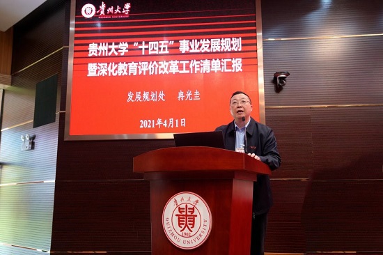 Ran Guanggui, director of the Development Planning Department, briefs attendees on the career development targets for Guizhou University’s 14th Five-Year Plan period (2021-2025) as well as the university’s implementation strategies for educational assessment reform that is appropriately tailored for the new era.