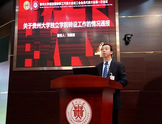 Deng Chaoyong, member of the Standing Committee of the Party Committee and Vice President of Guizhou University, delivers a report on the university’s readiness in transforming its independent colleges, in accordance with the policies of the Ministry of Education, guidelines from conferences organized by the Guizhou Provincial Department of Education, and promotion from the university itself.