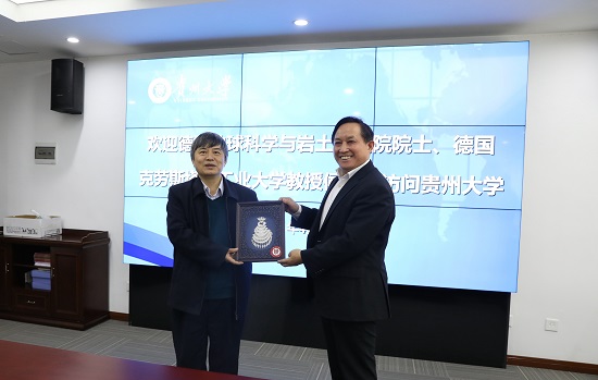 On the afternoon of April 13, Hou Zhengmeng, academician of Germany’s Earth Sciences and Geotechnical Engineering Academy and professor at Clausthal University of Technology (CUT) in Germany, visited Guizhou University (GZU). The director of the Office of International Relations, Hong Yun, presided over a meeting held in Room 2020 of the Xianzheng Building on West Campus. Key personnel from the university attended the meeting, including vice president Wu Pan and coordinators from related departments and colleges. GZU President Song Bao’an met with professor Hou and exchanged souvenirs with him before the meeting.