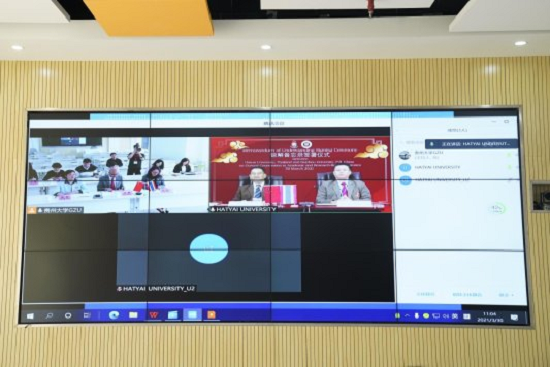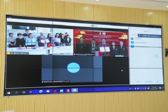 Guizhou University had an online signing ceremony for a memorandum of understanding concerning the development of academic research cooperation with Hatyai University on March 30, 2021. The ceremony was attended by Wittawat Didyasarin Sattayarak, president of Hatyai University; Wu Zhenwen, Chinese principal of Wan Li Tong Language School; Nongnuch Chivasrirungrueng, Thai principal of Wan Li Tong Language School; and Wu Pan, vice president of Guizhou University. The academic assistant to the president of Hatyai University, heads and staff from the Guizhou University Foreign Affairs Office and Hatyai’s Universty’s International School, and leaders and staff from both the Office of International Relations and College of International Education of Guizhou University also attended the meeting. Hong Yun, director of Office of International Relations of GZU, presided over the ceremony.