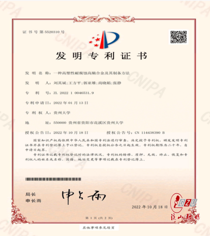 Recently, Prof. Liu Qibin's team published a research result entitled “A Novel D022 Precipitation-hardened Ni2.1CoCrFe0.5Nb0.2 High Entropy Alloy with Outstanding Tensile Properties by Additive Manufacturing” in the SCI 1 top journal Virtual and Physical Prototyping (IF=10.96) in the field of additive manufacturing. The first author of the research is Wang Fangping, a 2021 PhD student in the School of Materials and Metallurgy of Guizhou University, and the corresponding author is professor Liu Qibin. The work was supervised by prof. Dong Chuang of Dalian University of Technology and Guo Yaxiong, distinguished professor of Guizhou University.