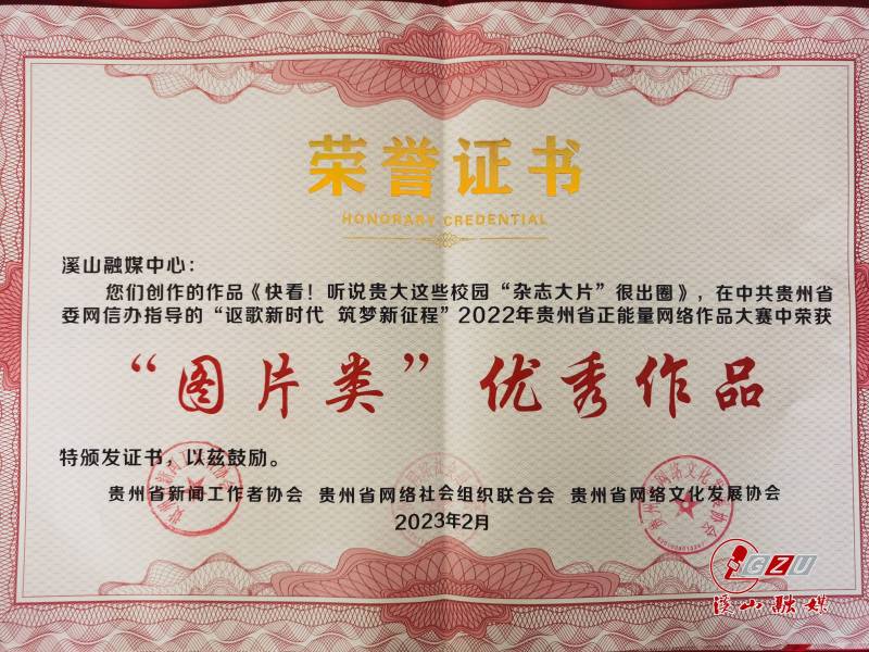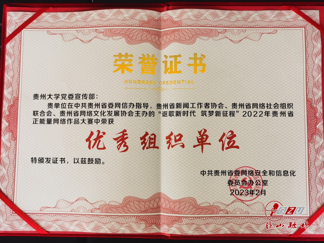On July 12th, the 2023 Guizhou Internet Culture Festival and Internet Civilization Promotion Season, known as the "Internet Civilization Guizhou Action," commenced in Guiyang. During the opening ceremony, the Guizhou Province Positive Energy Online Works Contest awards were presented. GZU's Party Committee Publicity Department earned the title of "Outstanding Organizing Unit" for its contributions to the 2022 Guizhou Province Positive Energy Online Works Contest, themed "Singing Praises of the New Era, Building Dreams for the New Journey." Additionally, GZU's work titled "Look! These Campus 'Magazine Shots' from Guizhou University are Trending," produced by the Xishan Media Center, received the "Excellent Work Award" in the picture category.