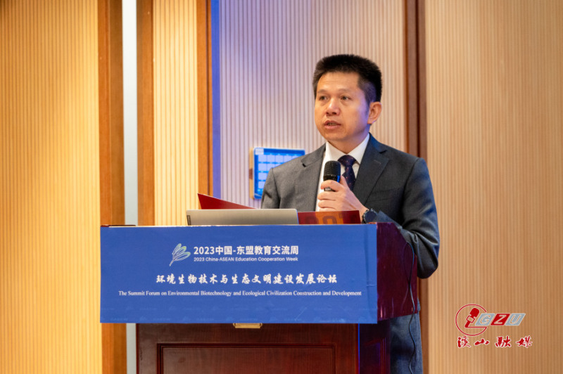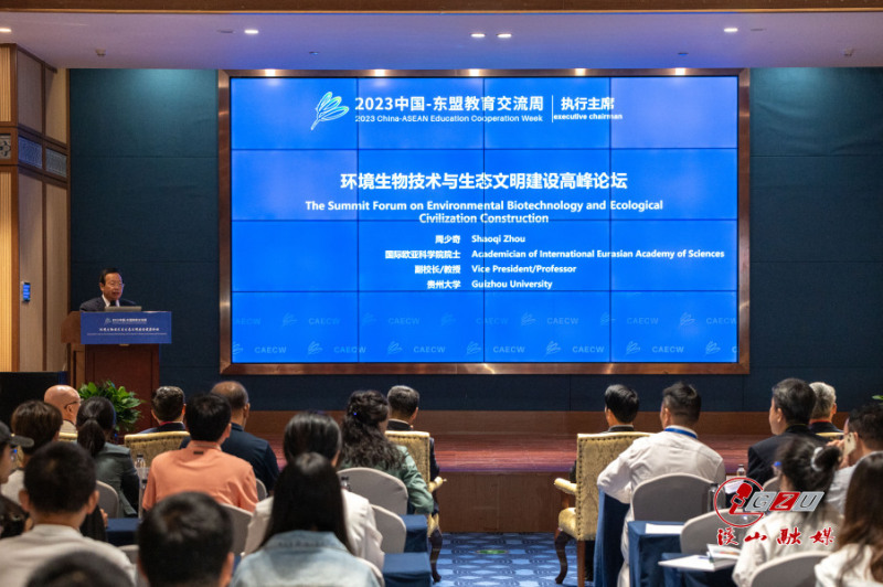 On September 1, the first Summit Forum on Environmental Biotechnology and Ecological Civilization Construction took place at the permanent site of the China-ASEAN Education Cooperation Week (CAECW). The forum was organized by GZU in collaboration with institutions including the Field Science Observation and Research Station of the Ministry of Education for Guizhou Karst Environmental Ecosystem. Themed “Low-Carbon Green, Innovative Development”, this event aimed to align with new circumstances, seize emerging opportunities, and actively explore the harmonious coexistence prospects of humans and nature in the context of carbon peaking and carbon neutrality goals. The forum was conducted through a combination of both online and offline methods.