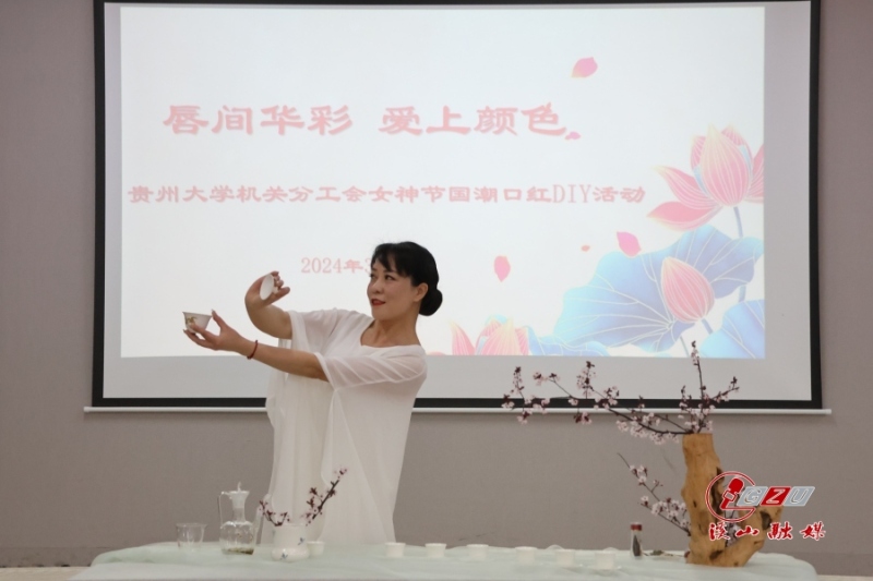 During the event, Yang Xuqin, a teacher from College of Tourism and Culture Industry and President of Guizhou Etiquette Society, delivered a lecture on the history, economic impact and colors of lipstick, and the art of making lipstick. After that, GZU Student lecture troupe put on a poetry recital titled "To Unfold Women's Brilliance in the New Era," which highlights the elegance and strength of contemporary women. Following this, Yan Xia, Deputy Secretary-General of the Guizhou Etiquette Society, performed a captivating tea dance that merged traditional tea culture with the art of dance, depicting a harmonious and beautiful society.