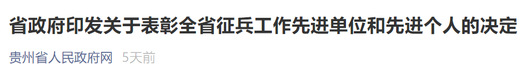 贵州省人民政府网:省政府印发关于表彰全省征兵工作先进单位和先进个人的决定