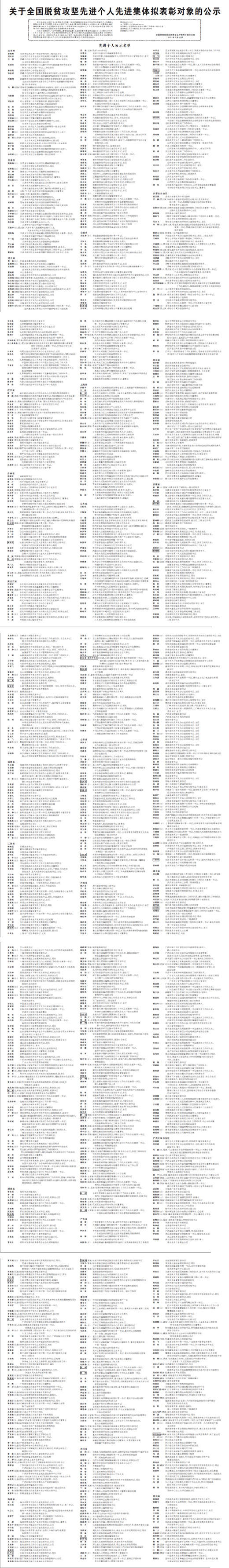 2月10日,全国脱贫攻坚总结表彰工作领导小组办公室发布公告,就以党中央、国务院名义表彰1982人为全国脱贫攻坚先进个人拟表彰对象(含追授61人)、1501个集体为全国脱贫攻坚先进集体拟表彰对象进行公示。其中,贵州113位先进个人和86个集体在公示之列。公告——党中央决定,以党中央、国务院名义表彰一批在打赢脱贫攻坚战中作出突出贡献的个人和集体。根据评选表彰工作部署,在各地区各部门充分酝酿、集体研究的基础上,经综合评审、统筹考虑,确定康柏利等1982人为全国脱贫攻坚先进个人拟表彰对象(含追授61人)、北京首农供应链管理有限公司等1501个集体为全国脱贫攻坚先进集体拟表彰对象。为充分发扬民主、广泛听取意见、接受社会监督,现就拟表彰对象进行全国公示,公示期为2021年2月10日至2月14日。对拟表彰对象有异议的,请于公示期内向全国脱贫攻坚总结表彰工作领导小组办公室反映。反映形式为电话、信函、电子邮件,信函以到达日邮戳为准。以单位名义反映情况的材料需加盖单位公章,以个人名义反映情况的材料应署实名,并提供联系电话。联系电话:12317电子邮箱:12317@cpad.gov.cn收件单位:全国脱贫攻